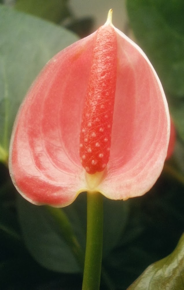 Антуриум — очень красивое крупное растение с глянцевыми, будто пропитанными воском, зелеными листьями.